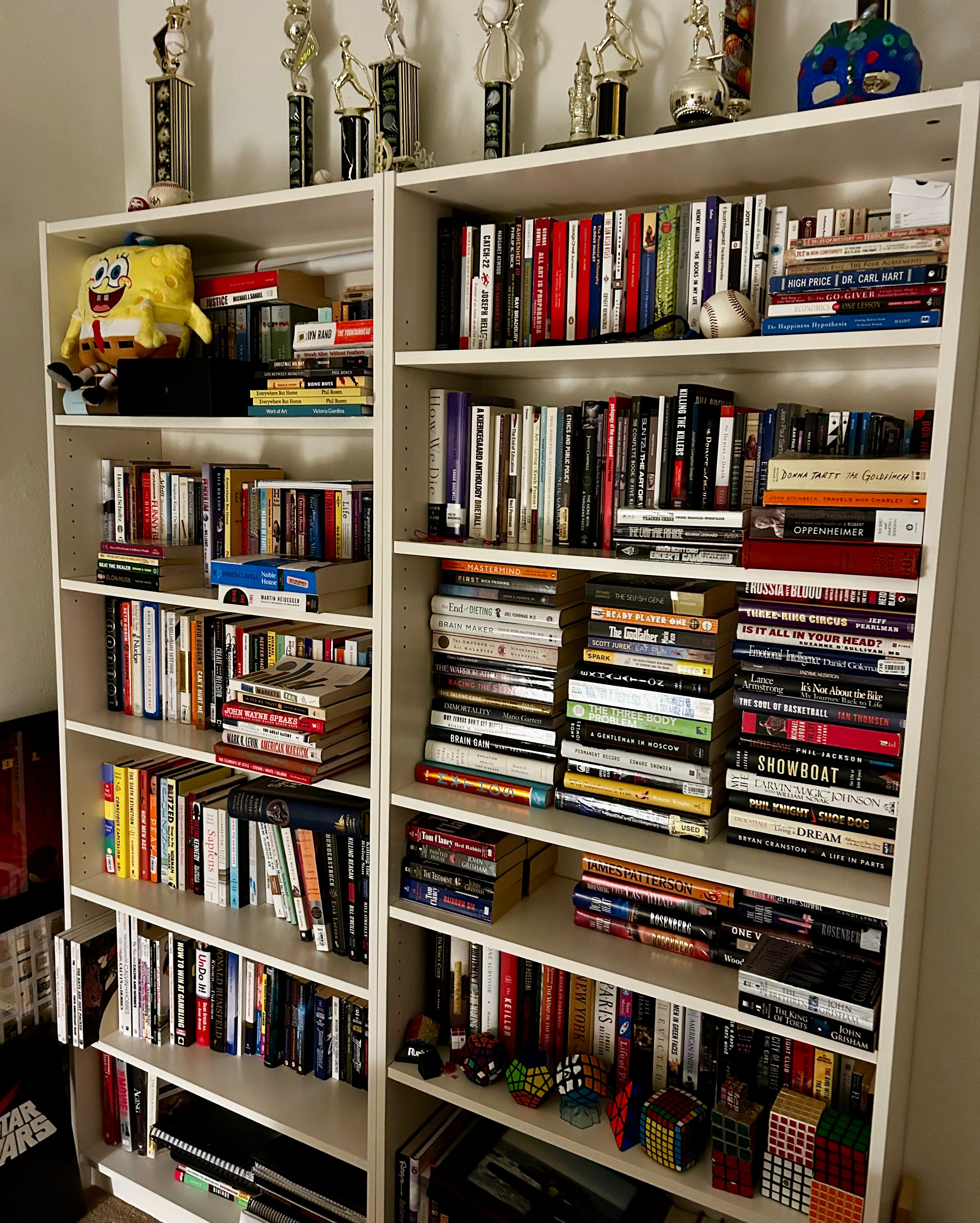 Though I haven’t added anything new in a long time, each time I walk by I find myself examining the shelves with great interest. It’s a great reminder of the books — and Rubik’s cubes, journals, and trophies — that shaped me.