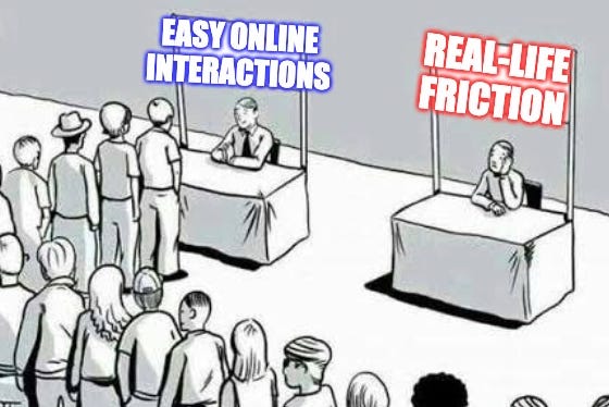 (By “friction” I mean anything that adds cost, effort, or context to an interaction — the things digital platforms have worked hard to eliminate.)