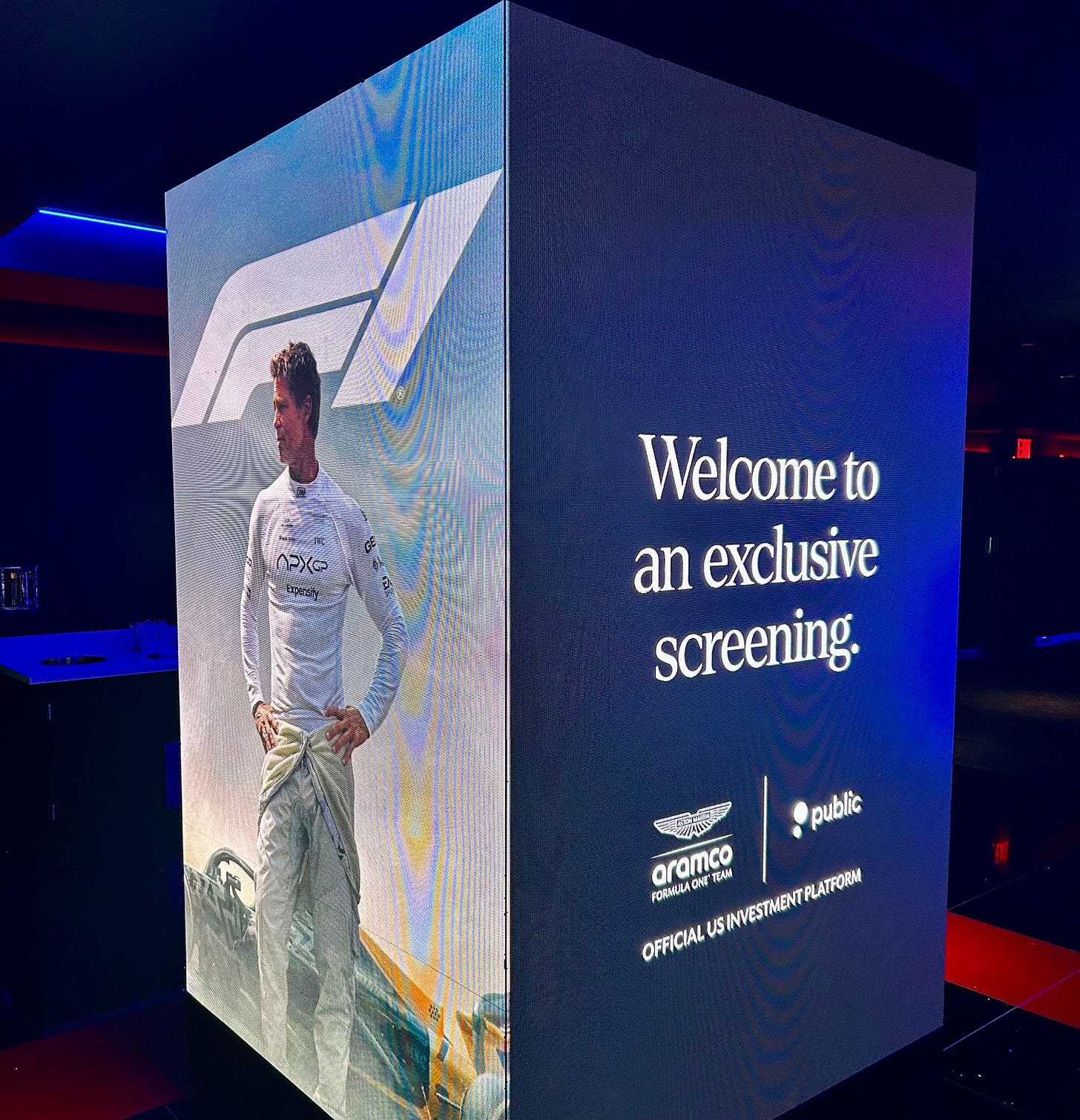 As we filtered out after the credits, Public — which also sponsors Aston Martin — was waiting to send us home with custom Formula 1-branded hats.