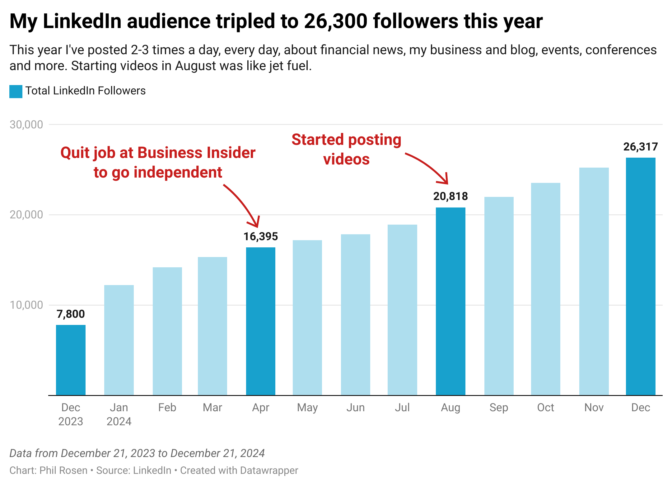 Meanwhile, my content on LinkedIn has received 44.5 million views this year, and my account surpassed 26,000 followers.