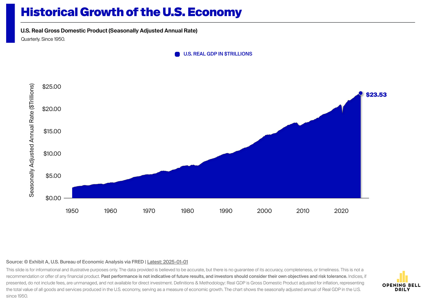 This upward trajectory is captured in the chart below, mapping what’s effectively been $23 trillion in uninterrupted US economic growth since 1950.