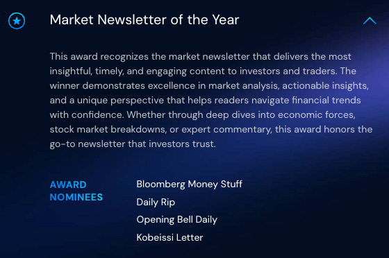 That trust has led me here: My financial newsletter, Opening Bell Daily, has been nominated for Best Markets Newsletter of the Year by StockTwits, next to three other newsletters including Bloomberg(!).