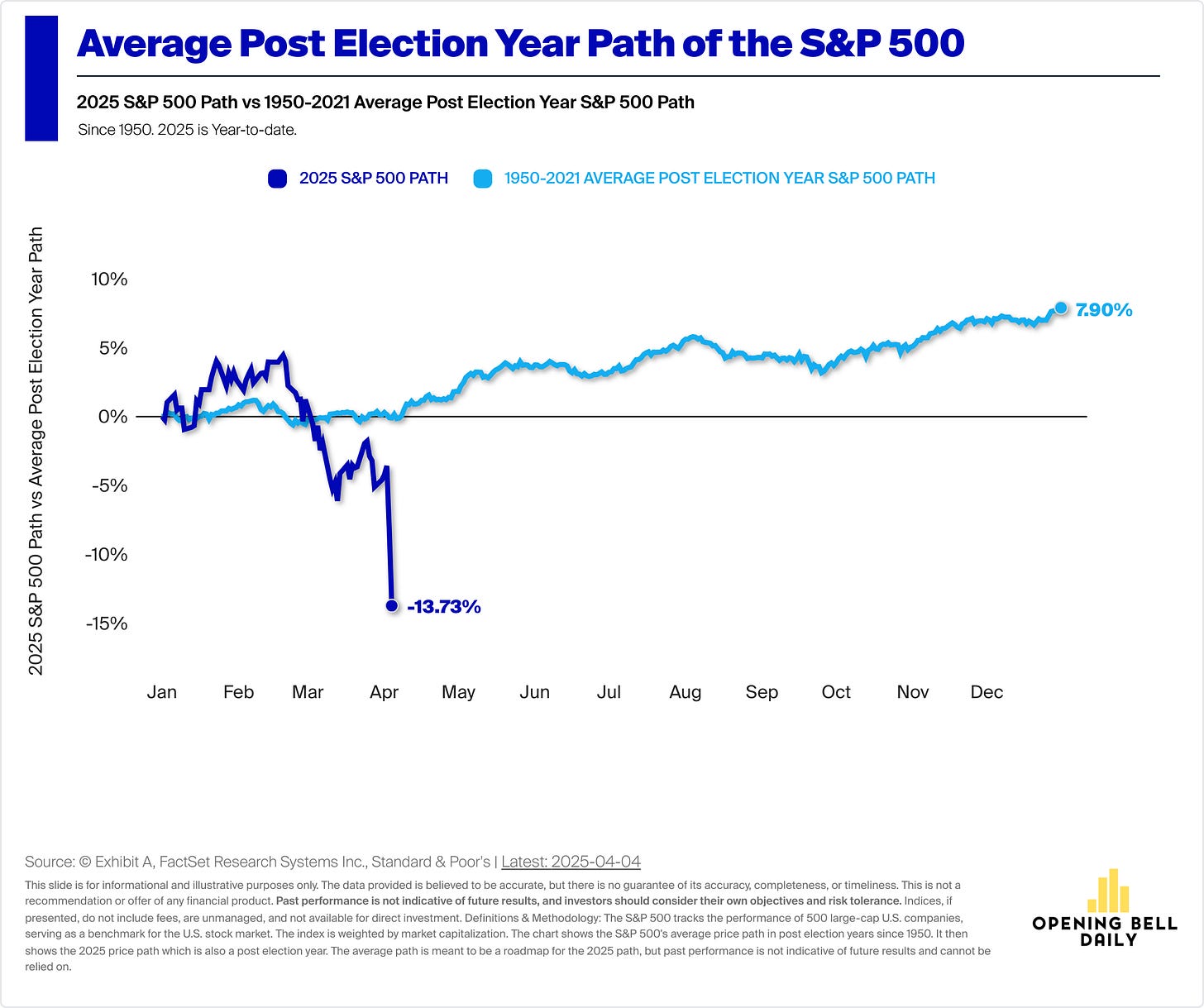 Here’s one chart that does not look so reassuring. The benchmark S&P 500 index is down nearly 14% to start 2025 — well below the average 8% gain seen the year after an election.