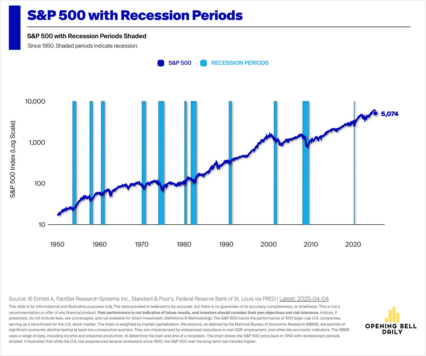 But zoom out and the shape of history returns. None of the 11 major US recessions since 1950 meaningfully derailed the stock market.